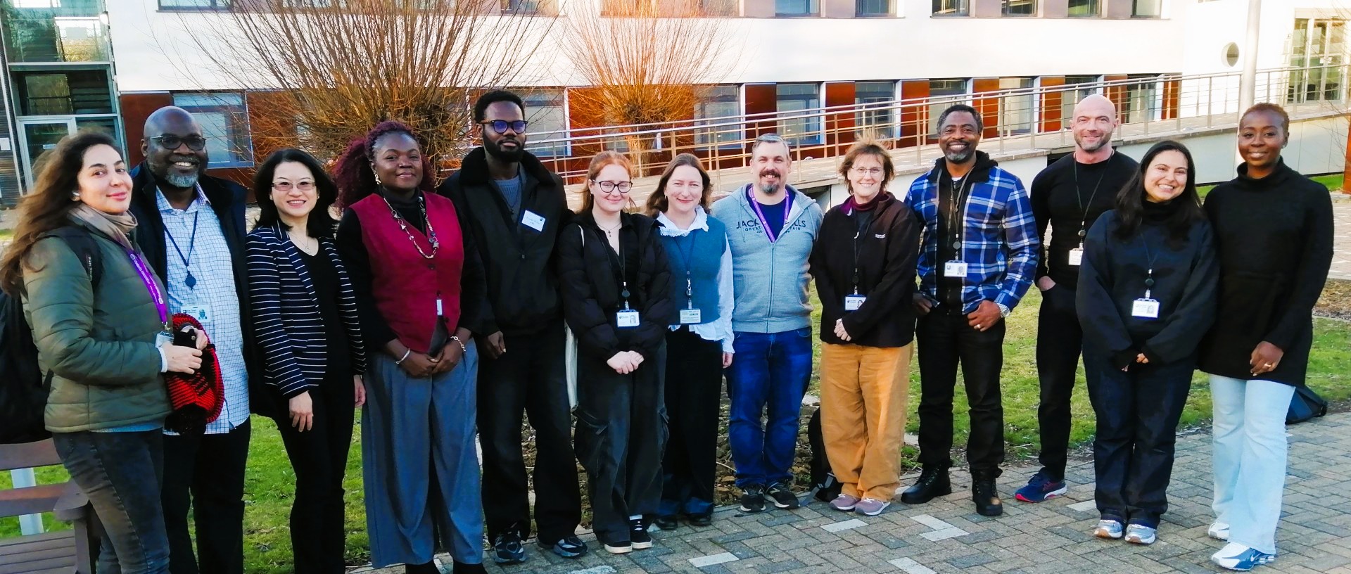 The photo shows, left to right: current students Fateme Filom and Joseph Rennaiye, Dr Xia Zhu, Amarachi Nzekwe, Evander Boakye, Amber Murray, Dr Alex Bristow, current student Tim Stevenson, Andrea Escott, current student Gabriel Omachi, Liam Liversage, Senah Tuma and Irene Roper-Spring.
